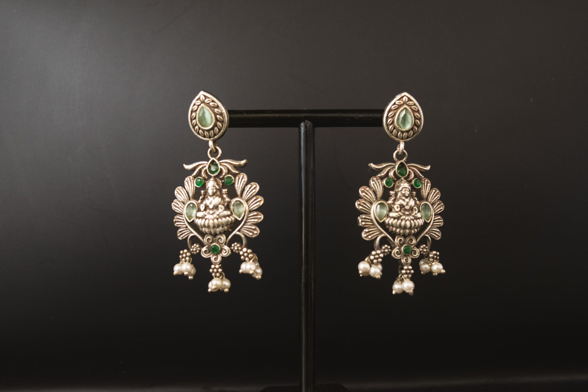 Celebrate divine beauty with these traditional Lakshmi motif earrings in oxidized silver. Embellished with mint green stones and intricate peacock feather-like elements, they symbolize blessings and grace. The danglers feature tiny pearls that add to the ethnic richness.
